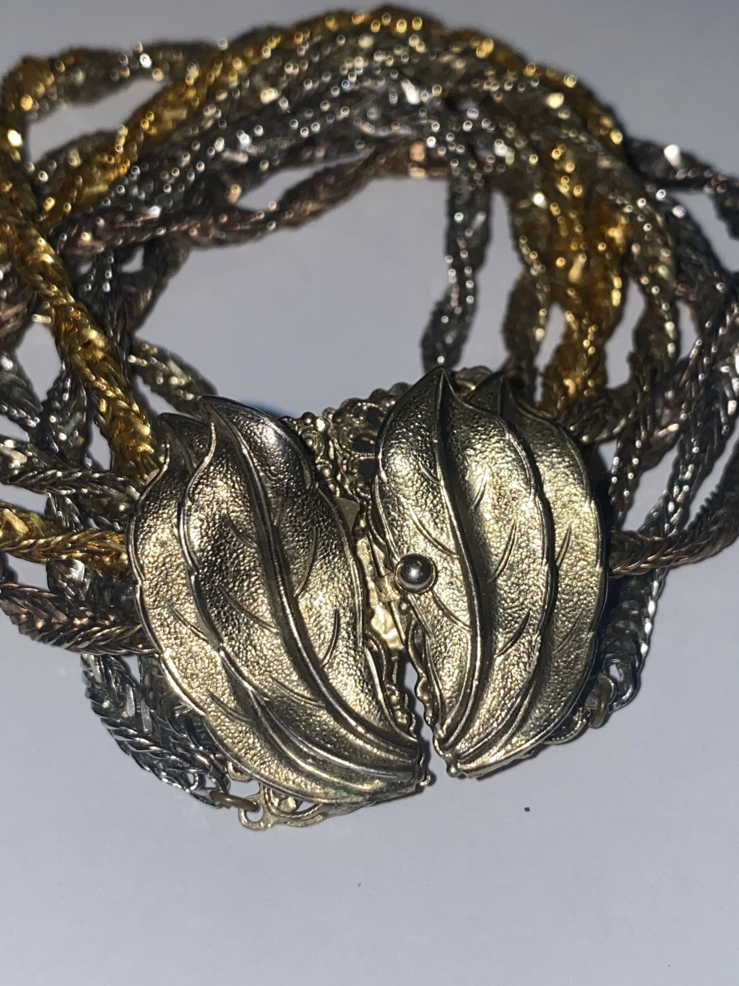 Heavy weight made up of multi chains in silver, bronze and gold tone metal.